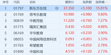 新东方在线续涨逾15%再创新高 领涨教育股板块