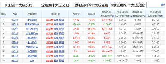 今日港股通(深)前十大成交个股是中芯国际、舜宇光学科技、新东方在线、小米集团-W、腾讯控股、金山软件、美团点评-W、微盟集团、融创中国和李宁。其中,净流入最多的是腾讯控股,为1.56亿港元,净流出最多的是舜宇光学科技,为1.36亿港元。