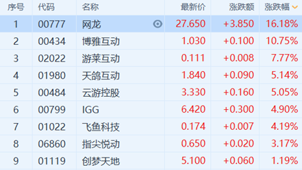 港A市场手游股全线走强 网龙(0777.HK)大涨逾16%