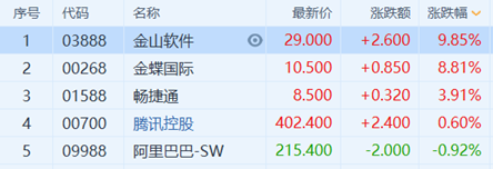 金山软件涨近10% 创2018年3月以来新高 领涨云办公板块