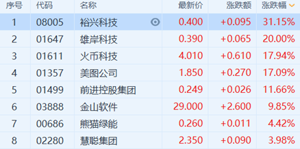 1、从港股通个股涨跌幅表现看,今日港股通标的中涨幅前五的个股分别是:美图公司(1357.HK)、网龙(0777.HK)、新东方在线(1797.HK)、TCL电子(1070.HK)、金山软件(3888.HK)。