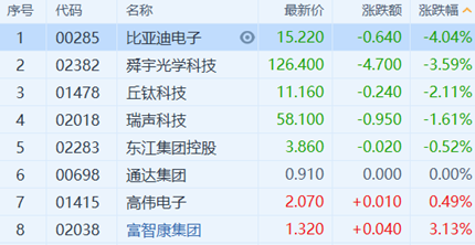 手机产业链个股普跌,其中比亚迪电子(0285.HK)跌4.04%,舜宇(2382.HK)亦跌近4%。