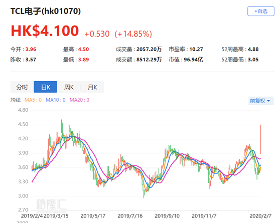 TCL电子大涨14.85% 2019年归母净利预增逾120%