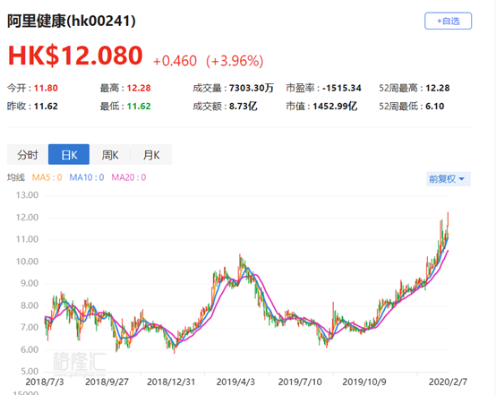 阿里健康(0241.HK)现报12.08港元,涨3.96%,成交8.73亿港元,最新总市值1452.99亿港元。