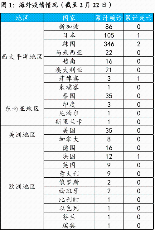 截至2月22日,中国境外累计确诊1402例,若不考虑“钻石公主”号确诊病例,则累计确诊病例最多的5个国家分别为:新加坡(累计确诊86例)、日本(累计确诊105例)、韩国(累计确诊346例)、泰国(累计确诊35例)、马来西亚(累计确诊22例),日韩几近爆发边缘。我们针对上述国家梳理了各国当前官方认定情况: