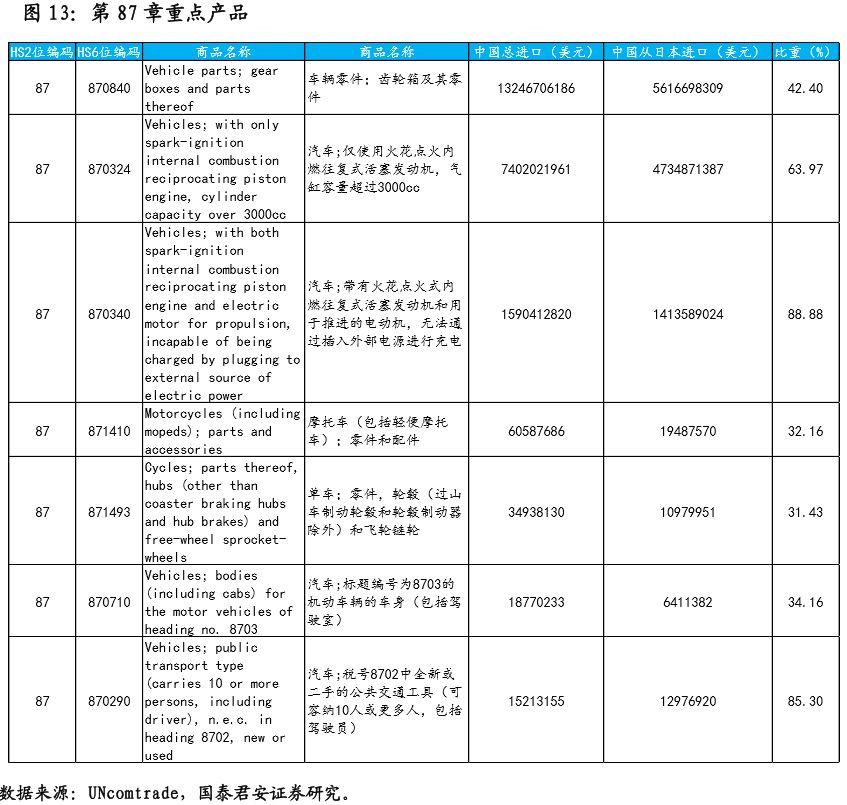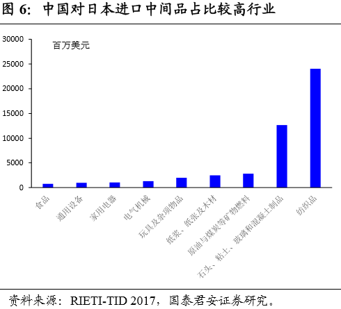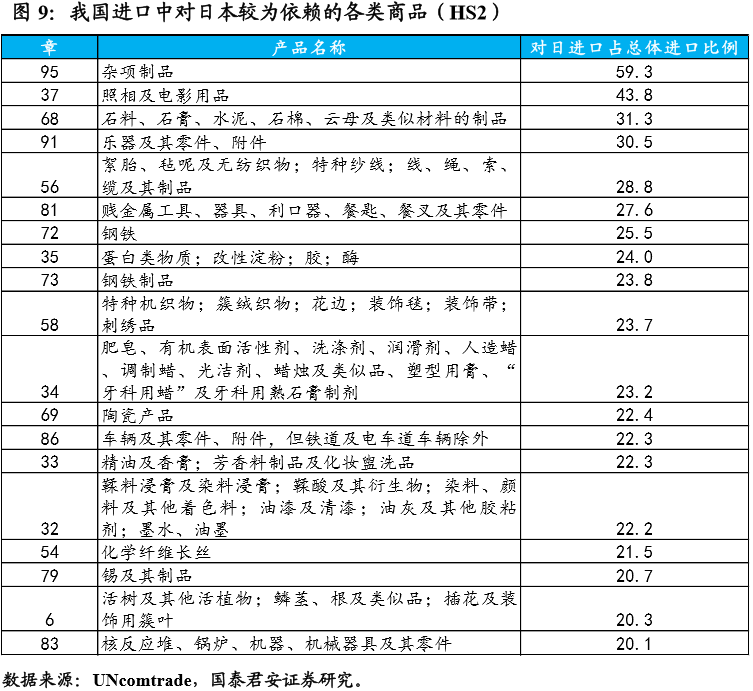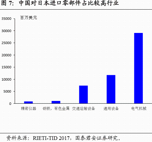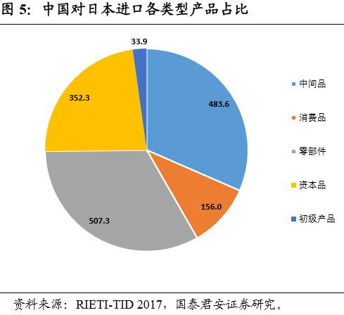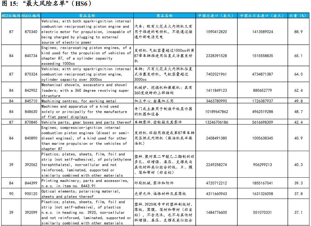 贸易方面,从大类行业下六位码的具体产品出发,我们认为中国对日进口中间品和零部件依赖较高,但零部件相关产品的产业链风险相对更大: