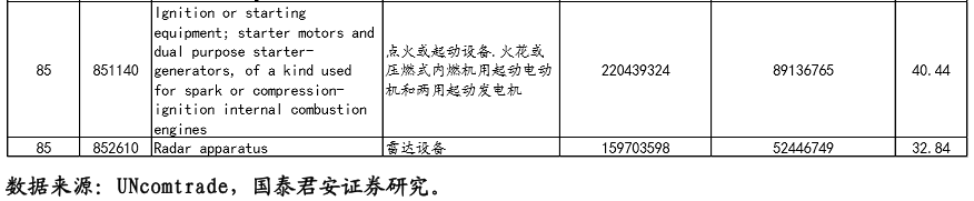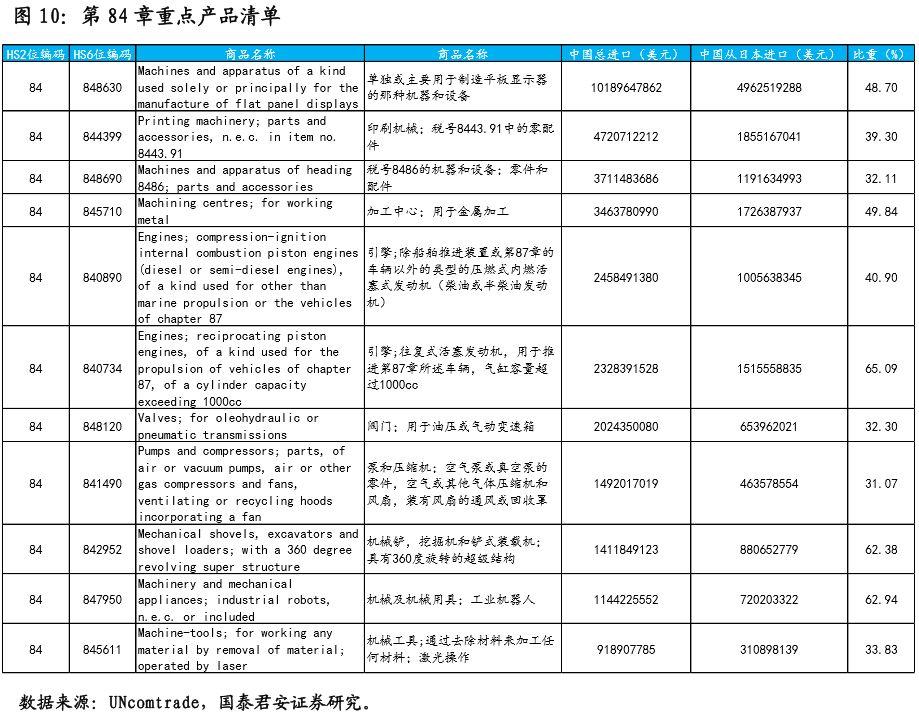 • 另一方面,从产业链长度来说,以机械设备技术密集型行业来看,产业链长度要长于纺织等传统制造,因此对于行业上下游的影响也将更大。因此,对于具体产品分析,我们主要集中于零部件产品相关联行业,主要是部分机械设备和运输设备细分产品进行挖掘(84-90章)。