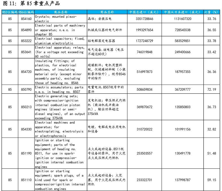 在(电机、电气设备及其零件;录音机及放声机、电视图像、声音的录制和重放设备及其零件)中,我们挑出了12个细分产品(图11),对日本进口依赖较强的产品集中于电蓄电池、点火启动设备等。