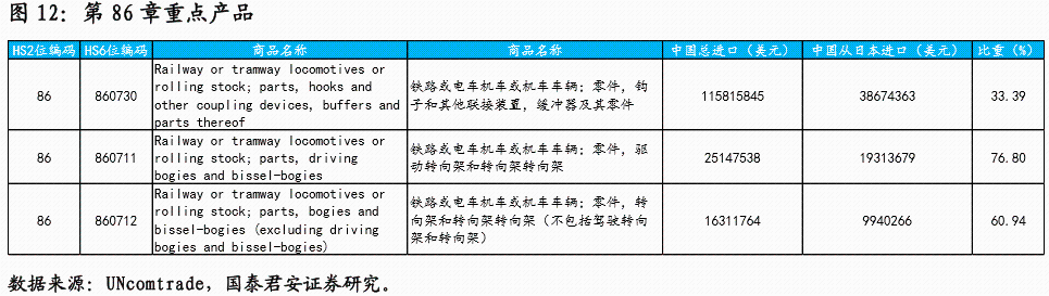 在(铁道及电车道机车、车辆及其零件;铁道及电车道轨道固定装置及其零件、附件;各种机械交通信号设备)中,我们挑选出了3个细分产品(图12),对日本进口依赖较强的产品集中于铁路、电车机车或机车车辆的联接装置、转向架等。