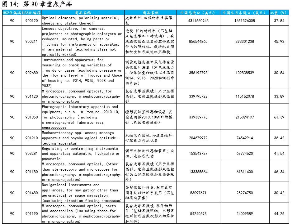 在(光学、照相、电影、计量、检验、医疗或外科用仪器及设备、精密仪器及设备;上述物品的零件)中,我们挑出了18个细分产品(图14),对日本进口依赖较强的产品集中于照相机、摄影实验室仪器、牙科配件、光学元件等。