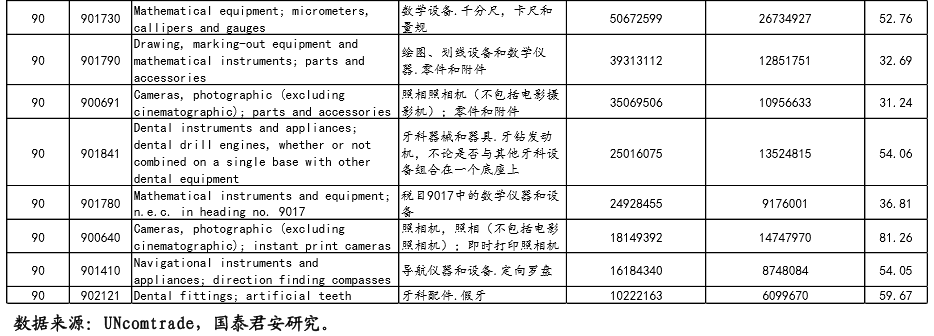 • 光学电子设备、医疗等仪器大类产品中,对日依赖集中于照相机、摄影实验室仪器、牙科配件、光学元件等