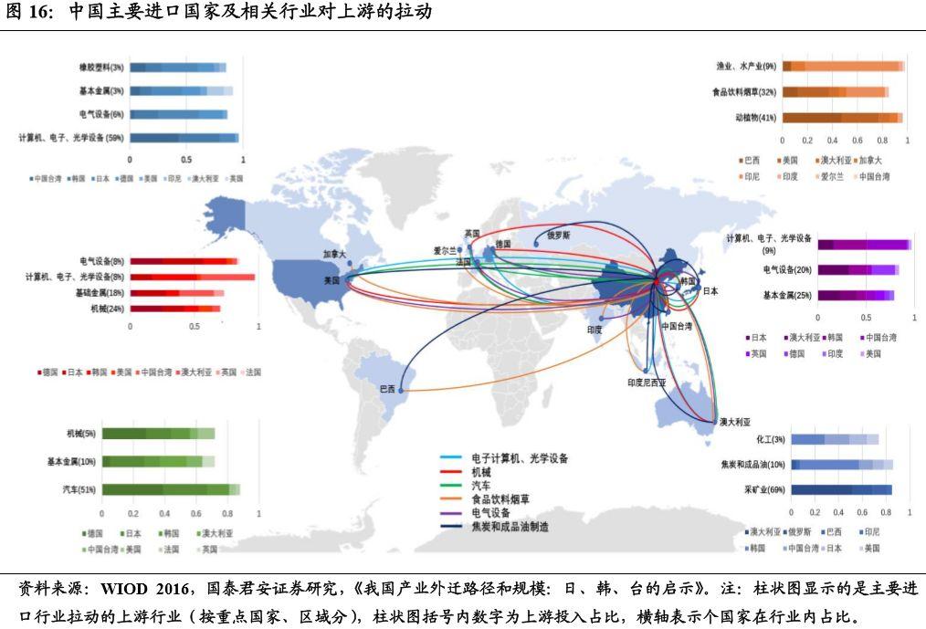 全球投入产出方面,我们发现在中国主要产业的上游方面,日本主要集中在计算机电子光学设备、电气设备、基础金属、橡胶塑料、机械设备、汽车与运输设备行业(图16)。