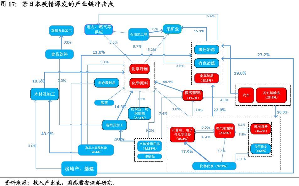 产业链角度,我们从全球投入产出表出发,发现在中国主要产业的上游方面,日本主要集中在计算机电子光学设备、电气设备、基础金属、橡胶塑料、机械设备、汽车与运输设备行业。如果把疫情的潜在影响纳入产业链传导体系,我们发现主要有两条产业链受影响较大: