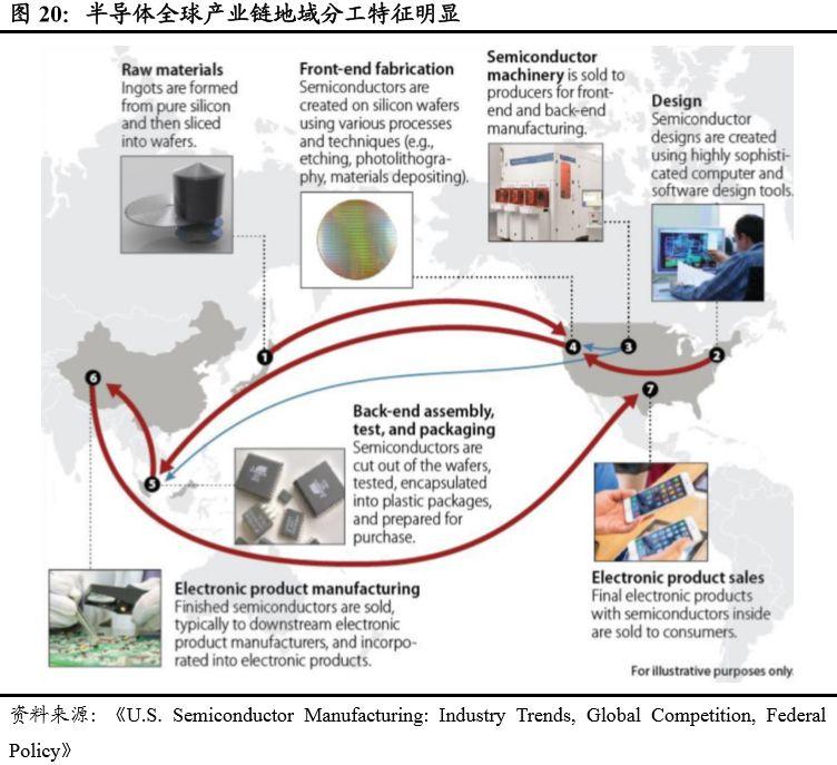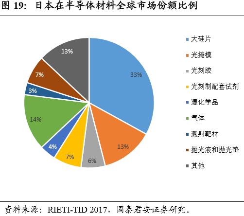 日本本土半导体材料核心龙头企业包括凸版印刷、信越化学、日本合成橡胶等。凸版印刷目前一是全球最大的光罩生产企业,产品线完整,占据全球超过30%的光罩市场份额,信越化学是全球最大的半导体硅片供应商,2015年在全球半导体硅片市场中占有27%的份额。硅片及硅基材是半导体材料中最重要的部分,占半导体材料市场份额的32%,而日本合成橡胶公司是全球最大的光刻胶生产商。我们看到日本在半导体原材料领域的影响,对于国内不仅有原材料的直接影响,也存在通过美国等其他国家制造带来的零部件间接影响(图20)。