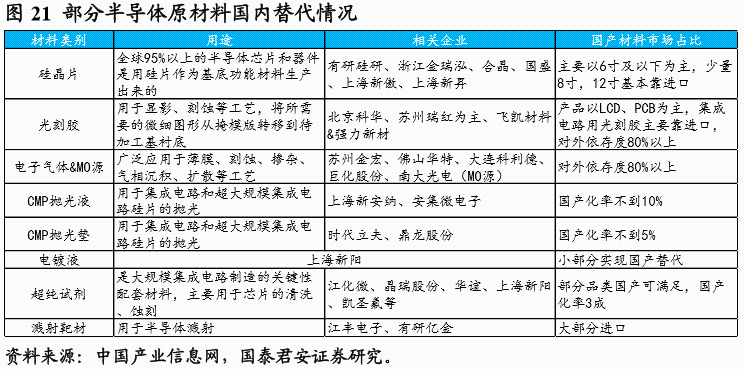上述原材料领域在集成电路产业链中主要与IC设计中版图设计,以及IC制造中的光刻和单晶硅片相关联。此外在材料方面,日本在全球市场份额中在前端的Si晶圆,以及后端的焊线,陶瓷板、塑料板、封装材料方面也占据着重要地位。与此同时,多数材料的国产化率当前仍然非常有限(图21)。