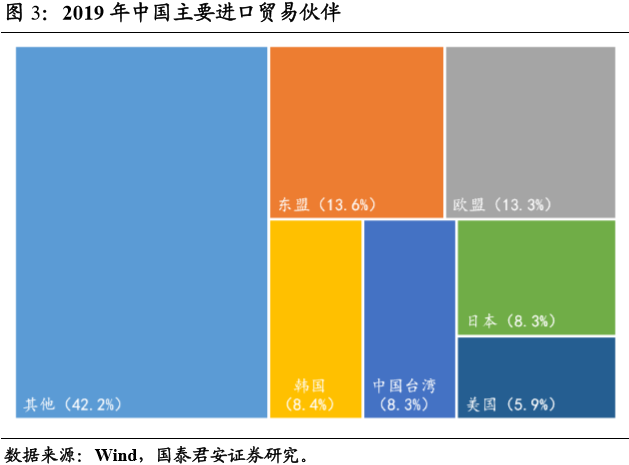 日本作为我国进出口第四大贸易伙伴国,对于国内贸易层面影响在海外疫情国家中相对较大。进口角度,2019年我国全年进口金额20771.0亿美元,其中自日本进口比重达到8.3%(图3)。