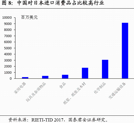 从细分行业来看,对日进口中间品集中在纺织品、非金属制品行业(图6),而零部件产品集中在电气机械、通用设备、交通运输设备(图7)。中国对日进口消费品主要集中在交通运输设备和化学制品领域(图8)。
