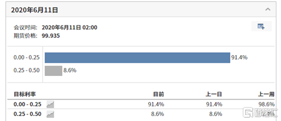 当前而言,市场预期联邦基准目标利率将保持在0-0.25%的概率高达91.4%,说明市场并不预期美联储会采取更为激进的“负利率”政策。