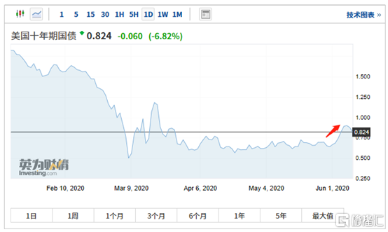 上周五,出人意料的非农数据披露后,10年期国债收益率一度飚升1%左右,最高达到0.96%,上周累升24BP,为去年9月以来单周最大涨幅。