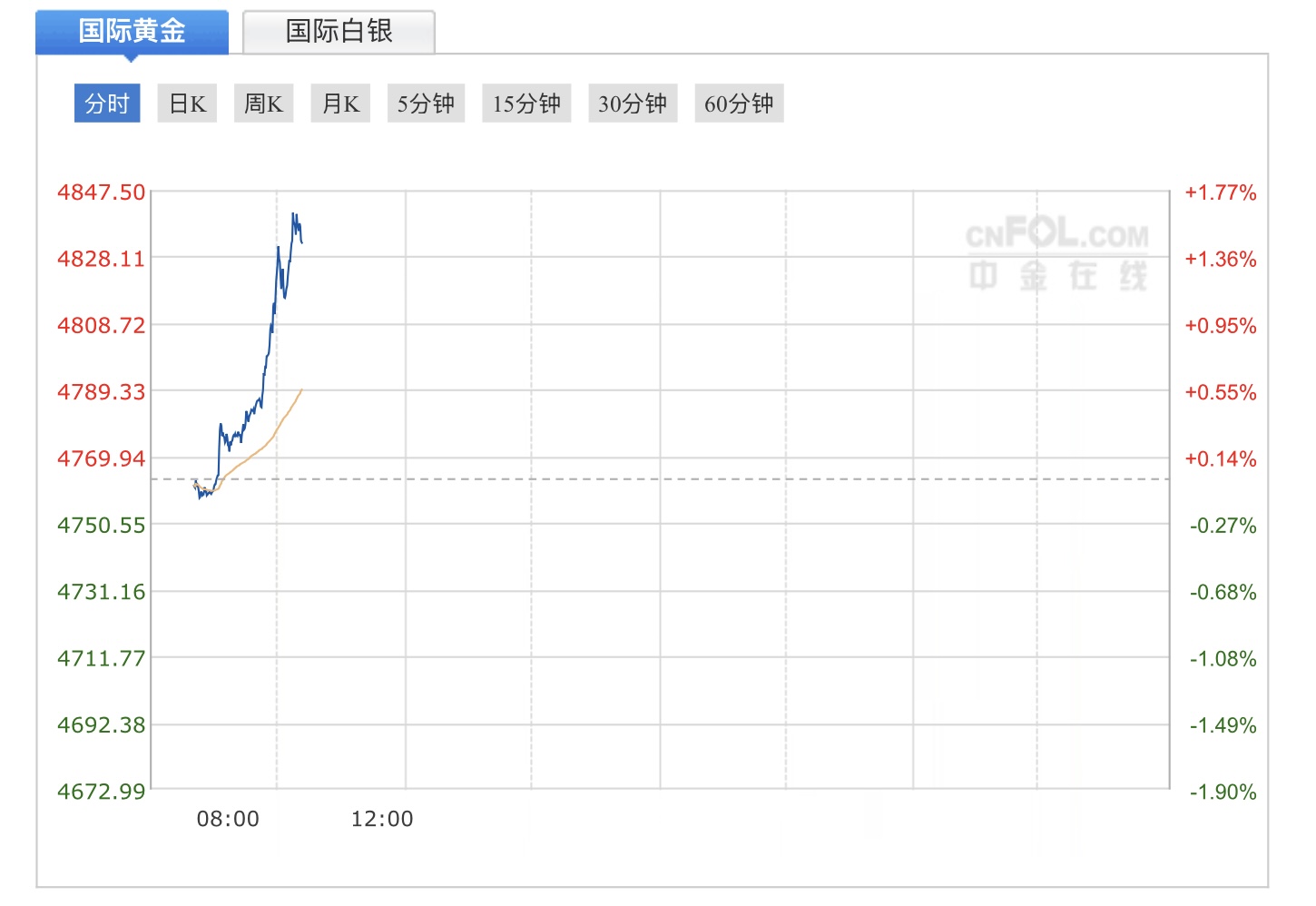 在避險資金持續流入下,貴金屬價格再度走強。週二亞洲時段,現貨黃金價格一度升至 4847 美元/盎司 附近,日內漲幅接近 1.8%;現貨白銀最高觸及 95.3 美元/盎司,盤中漲幅一度超過 1%,金銀價格同步刷新歷史高位。隨著全球市場風險偏好明顯降溫,金銀成為當前表現最強勢的防禦型資產之一。