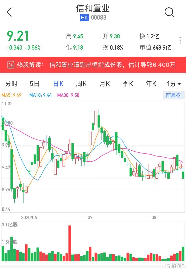 格隆汇8月17日丨信和置业(0083.HK)现报9.21港元,跌3.56%,暂成交1.2亿港元,最新总市值648亿港元。中国旺旺(0151.HK)现报5.7港元,跌3.06%,暂成交1.2亿港元,最新总市值707亿港元。恒生指数公司上周五(14日)晚间公布最新一期指数检讨结果,其中,信和置业、中国旺旺、中国神华遭剔出恒生指数成份股。大摩最新发研报指,信和置业遭剔出恒指成份股,估计导致6,400万美元资金流出,约相当于该股14日交易量,故预期其股价短期内受压,未来60天股价跑输大市的机会率高达80%。维持信和置业“与大市同步”评级,目标价11港元。