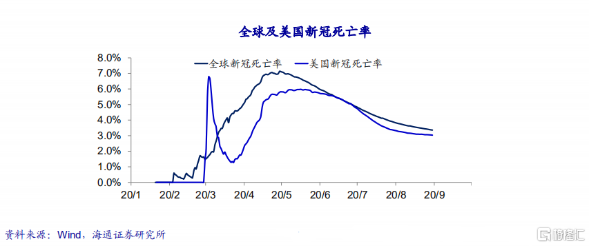 虽然目前新冠疫情并没有结束,全球感染人数还在持续增加,而且还没有有效的疫苗出现。但有一个最重要的好消息,就是新冠病毒导致的死亡率大幅下降,目前全球和美国的新冠死亡率均从峰值的7%左右降至3%左右的水平,远低于SARS当年11%的死亡率。