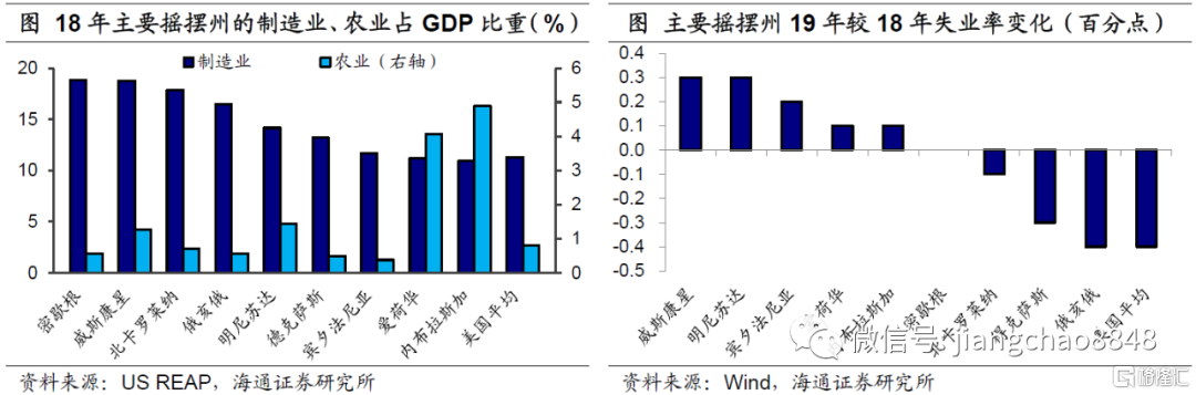 首先,特朗普在与中国的贸易问题上应不会再度采取过激行动。摇摆州是16年特朗普最终赢得选举的关键支持群体,因而若想获胜,特朗普必须扭转目前在摇摆州的颓势。为何本轮民调中摇摆州多数选择倒戈?从产业结构看,摇摆州多数为制造业和农业大州,且对中国有较高的贸易依赖度。因而在中美关税几度提高后,摇摆州不但没有受益于制造业的回流,反而受到了进口成本高增、出口遇阻的负面影响。从就业看,多数摇摆州19年的失业率改善幅度落后于美国平均,威斯康星州、明尼苏达州等甚至出现失业率的回升。