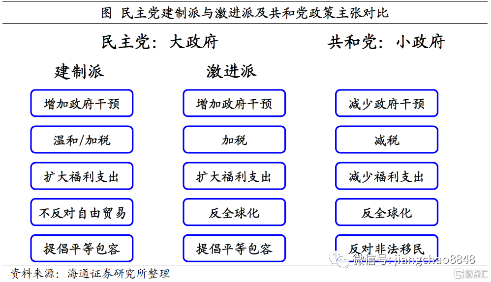 作为民主党传统建制派,本轮竞选中拜登的政治主张整体温和,基本延续奥巴马和希拉里的思路。具体来说,在财政上拜登支持对高收入群体征税,并提高财政支出;在贸易政策上主张多边贸易、团结盟友;在社会福利方面,更关注弱势群体,支持建立完善的社会福利和医疗保障;在人权方面,主张平等包容,“宽待”移民、认可LGBT人群、支持妇女权利等。