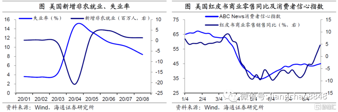 各种迹象均表明3季度开始美国经济有望明显复苏。随着封锁的逐步解除,5月开始美国人口流动性出现了明显改善。而随着人口出行的增加和经济活动的恢复,美国的就业持续向好。5月开始的4个月内,美国恢复了1061万个工作机会,失业率也从最高的14.7%降至8.4%。而消费作为美国经济的主体,消费者信心指数已经止跌回升,商业零售增速也已由负转正,预示着3季度开始美国经济有望强劲复苏。