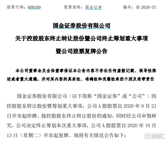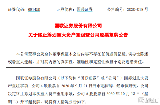 10月12日晚间,国金证券和国联证券同时发布公告,终止筹划重大事项,股票10月13日(周二)复牌。