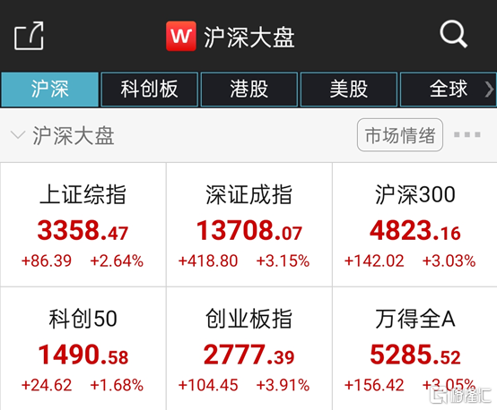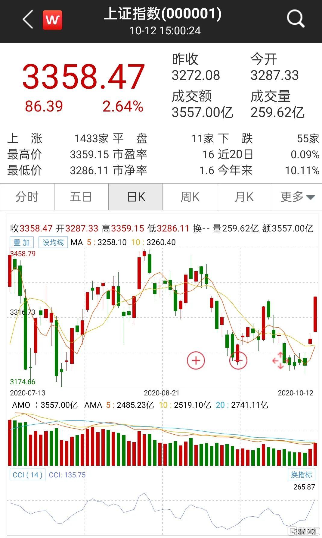 10月12日,A股三大股指高开高走单边上涨,延续强势走势。截至收盘,上证指数收报3358.47点,涨2.64%;深证成指报13708.07点,涨3.15%;创业板指报2777.39点,涨3.91%;万得全A报5285.52点,涨3.05%。两市合计成交金额9714亿元,环比增近四成,显示增量资金稳步入场。