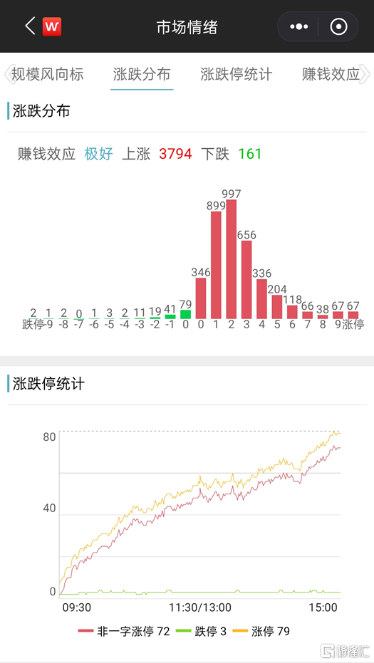 个股全线上扬。两市3794只股票上涨,下跌个股仅有161只。79只个股涨停。