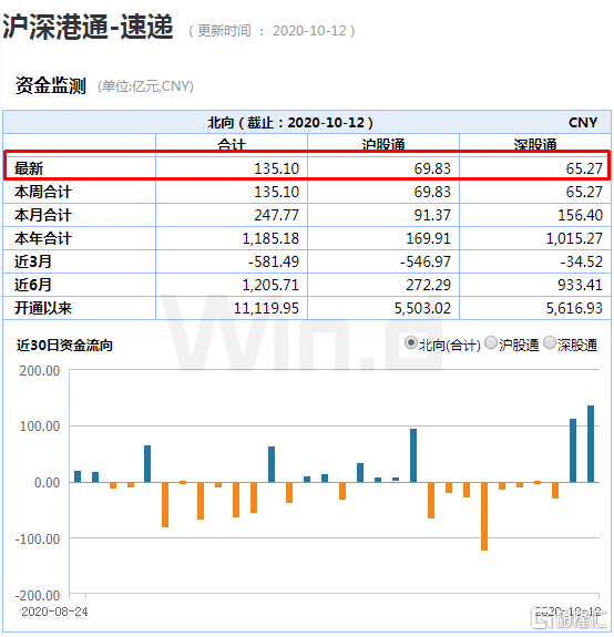 Wind数据显示,节后两个交易日北向资金大举进场扫货,继上周五净买入超112亿元后,周一再度单边净买入135.1亿元,累计净买入近250亿元。其中沪股通净买入69.83亿元,深股通净买入65.27亿元。