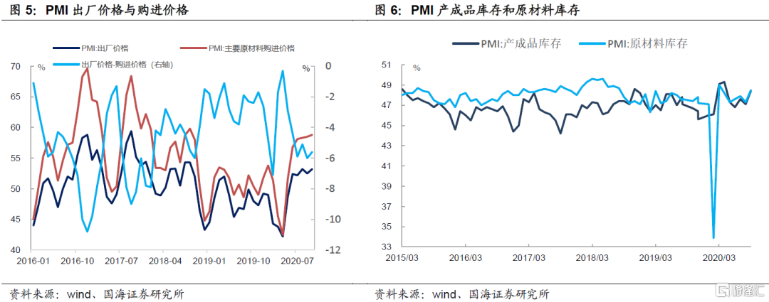 价格数据回升,企业盈利空间有所改善。10月PMI购进价格上升0.3个百分点至58.8%,PMI出厂价格上升0.7个百分点至53.2%,购进价格和出厂价格均上升到今年以来的最高点。PMI出厂价格-购进价格差值为-5.6%,较上月环比上升0.4个百分点,企业盈利环境有所改善。