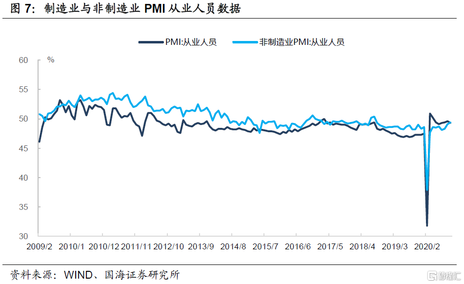 从各分项上来看,除新订单指数外,各分项指数均略有下滑。从企业规模上来看,除大型企业PMI较上月上升0.1个百分点外,中小企业PMI均较上月出现小幅回落,小型企业PMI回落到临界点以下,表明小型企业复苏仍面临一定压力。