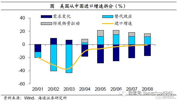 而事实上,疫情以来海外各品类需求间的“替代”,也相对有利于我国出口的提升。比如,5-8月间美国的需求占比提升最显著的品类包括家具杂项、办公用机械设备、电信录制设备等,同样也是我国较具出口比较优势的品类,而如石油原料、交通运输设备等我国优势较小的品类进口需求出现明显下降,但对我国影响较小。