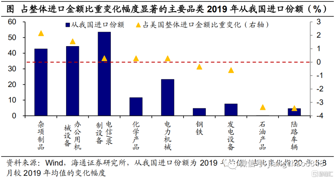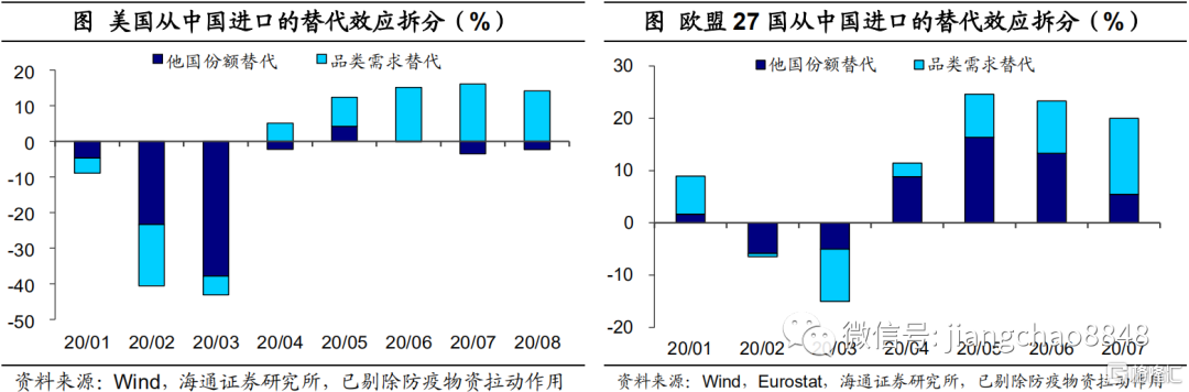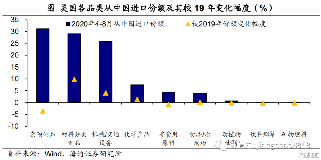 若将我国出口占全球贸易量份额的整体提升计作替代效应,则替代效应实际上应包含两个方面。一方面,对于单一品类,替代效应体现为通过抢占其他国家出口份额,来提升我国占比。以美国为例,尽管我国生产全面恢复,各品类出口份额的变化却并不同步。4-8月美国主要进口品类中,材料分类制品、机械交通设备、化学产品来自我国的比例较19年出现明显提升,其他如矿物燃料、食品饮料等则表现平平。这也意味着,此前对我国进口依赖度更高,也就是我国较具比较优势的品类,更容易抢占市场份额,也更有可能转化为永久性替代。