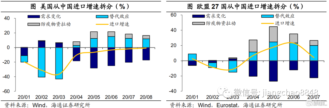 • 份额替代效应减弱,需求调整仍可延续。其次,需求回暖过程中,我国率先恢复的生产迅速抢占了其他国家的出口份额。不过随着海外产能复苏,在主要地区中的出口替代效应也普遍呈现回落的趋势。若将我国出口占全球贸易量份额的提升整体计作替代效应,替代效应一方面体现为对其他国家出口份额的挤占,另一方面由进口国国内的需求结构调整相对利于我国出口导致,也就是“他国份额替代”和“品类需求替代”两个方面。将我国对美国和欧盟27国的替代效应拆分发现,6月以来对他国的替代效应已相对减弱,主要出口国需求结构的调整成为支撑我国出口份额的主要因素。而美欧疫情二次爆发下,需求结构调整延续的可能性较高,包括对办公用品、家具杂项、电信设备等的需求预计继续高涨,支撑我国出口占全球贸易份额保持高位。