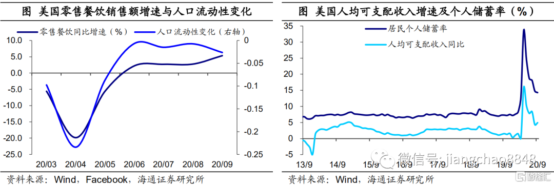 需求的回暖与人口流动限制缓解相关度较高。事实上,疫情对经济的拖累主要在于人口流动的限制。因而5月以后,随着美国人口流动性的快速恢复,终端消费也呈现同步恢复的趋势。另一方面,与国内以促进经济活动恢复为主的策略不同,美国疫情期间的财政货币政策刺激更多地着眼于需求端管理,使得当地的居民收入在疫情期间反而出现跳升,进一步加快了需求的修复。
