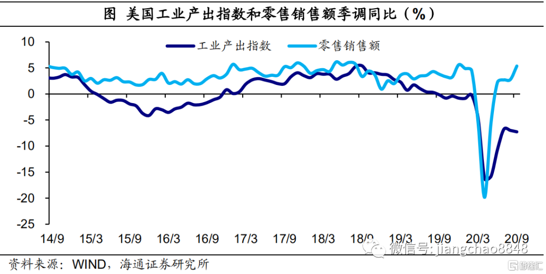 尽管需求恢复进度可观,欧美主要国家的供给能力并未同步恢复。以美国为例,美国的零售销售额同比在6月已由负转正,此后持续回升,9月同比更是超过了5%。而对比之下,美国工业产出指数同比增速尚在负值区间,甚至在89月掉头呈现下行趋势。