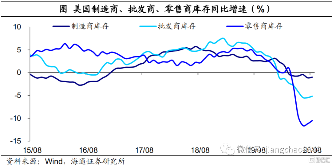 事实上,尽管整体补库拐点未现,但结构上零售商库存同比已触底回升。作为消费主导型国家,美国零售商库存更贴近下游消费,对需求变化更为敏感,相比之下,制造商库存则略有滞后。根据历史经验,零售商库存的拐点通常可以作为整体补库的领先指标,7月开始美国零售商库存同比增速触底回升,预计后续美国整体主动补库的启动也不会太远,从而有望接力支撑我国出口增速。