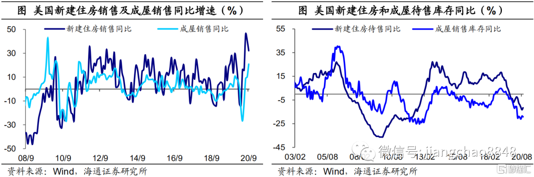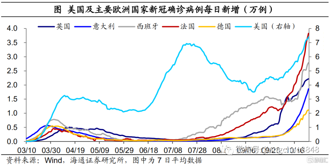 • 疫情难改回暖大势,未来补库动力可期。外需改善主要因素,疫情难改回暖大势。最后,外需改善仍是带动我国出口增速回升的最主要因素。5月以后终端消费的逐步回暖,一方面受益于人口流动性的快速恢复,另一方面,与应对疫情出台的财政货币政策直接作用于居民收入相关。尽管9月以来新增病例迅速上涨,消费回暖的决定因素并未出现逆转,因而只要后续不再重启长期严格的封锁措施,美国需求持续修复的大趋势不会改变。相比之下,欧洲主要国家相继推出封锁措施,需求回暖短期或现反复。需求先行库存大降,未来补库动力可期。而由于海外需求恢复较生产明显领先,美欧等地区的库存持续去化,目前已降至历史较低水平。后续或迎来新一轮补库周期,而低利率环境下地产销售的高景气度,也将为本轮补库存注入较强动力。海外补库存有望接棒拉动我国出口高增。