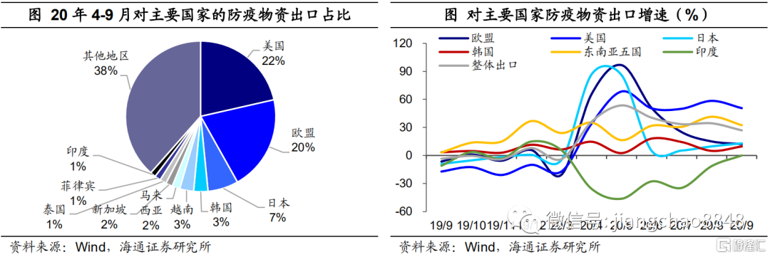 防疫物资出口主要地区中,对美出口仍处高位,而欧盟则持续回落。从防疫物资出口对象看,今年4-9月美国和欧盟占我国防疫物资出口的比重超四成,日韩及东南亚国家则占到约两成。主要出口地区中,对美防疫物资出口同比仍在50%以上的高位,东南亚地区也维持较高增速,而对欧盟出口则自6月以来呈现持续下滑趋势,9月同比降至12%,但较正常时期仍高。此外,对印度的防疫物资出口则出现持续改善。