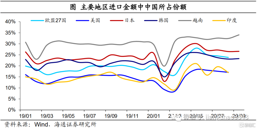 不过随着海外产能恢复,出口替代效应也呈现回落的趋势。作为我国出口主要目的地,19年美国和欧盟占我国出口金额比重约34%,加上日韩、越南和印度可主导我国一半以上的出口。受各国进出口数据口径限制,我们选用各国进口金额中我国获取的份额进行比较。除越南外,出口替代效应普遍在6月到达峰值,而后呈现持续回落的趋势。但截至9月,主要地区进口中,我国所占份额仍高于19年平均水平,其中欧盟27国进口中我国份额的提升最为显著。