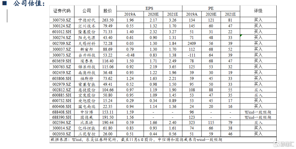 重点推荐标的:宁德时代(动力电池全球龙头、优质客户和领先技术)、汇川技术(通用自动化今年持续大超预期、动力总成全面突破大幅减亏)、隆基股份(单晶硅片和组件全球龙头、业绩持续高增)、阳光电源(逆变器龙头增长大超预期、储能业务前瞻布局)、天赐材料(电解液&六氟龙头、六氟超预期涨价弹性大)、新宙邦(六氟和电解液涨价、氟化工也超预期、业绩高增)、当升科技(正极龙头、海外占比高、员工持股计划托底)、璞泰来(负极全球龙头、LG 等海外占比高、隔膜和设备加强布局)、通威股份(硅料和 PERC 电池龙头、硅料价格坚挺)、锦浪科技(组串式逆变器龙头、业绩超预期高增长)、晶澳科技(组件一线龙头、前三季度超预期)、福斯特(EVA 和 POE 膜绝对龙头供不应求、感光干膜等新材料上量)、雷赛智能(控制卡和步进系统龙头、伺服和 PLC 全面起量)、科达利(结构件全球绝对龙头、客户锁定宁德和Tesla 等)、恩捷股份(湿法隔膜全球龙头、LG 等海外客户放量)、宏发股份(新能源汽车继电器全球龙头、传统继电器超预期复苏)、爱旭股份(专注高效电池的龙头、单瓦利润恢复超预期)、国电南瑞(二次设备龙头、电力物联网受益)。建议关注:中信博、固德威、比亚迪、亿纬锂能、三花智控、良信电器、赣锋锂业、华友钴业、福莱特、欣旺达、天齐锂业、嘉元科技、天奈科技、思源电气、正泰电器、麦格米特、星源材质、国轩高科、八方股份、林洋能源、金风科技、中国宝安、东方日升、许继电气、平高电气、长高集团、长缆科技、国网信通、日月股份、捷佳伟创、天顺风能、杉杉股份等。