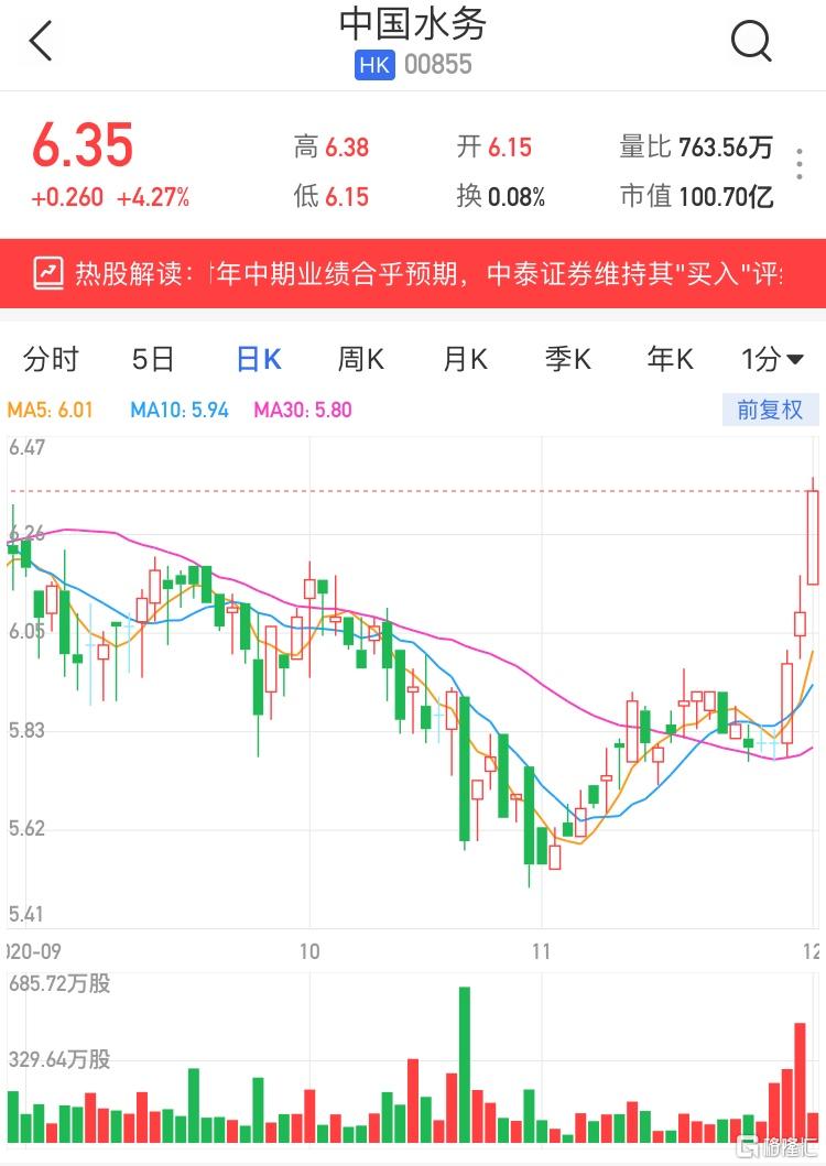 格隆汇12月1日丨中国水务(0855.HK)今日续涨,暂三日连升累涨近10%,现报6.35港元,涨4.27%,暂成交763万港元,最新总市值100亿港元。中国水务上周四(26日)午间公布,截至9月30日止6个月,集团实现收益51.31亿港元,同比增长17.8%;毛利21.10亿港元,同比增长13.3%;公司拥有人应占溢利8.26亿港元,同比下降6.2%;每股基本盈利51.68港仙,宣派中期股息每股15港仙。绩后中泰证券发研报指,公司2021财年中期业绩合乎预期,新冠疫情下持续扩张产能,该行料工商业对供水的需求可望改善,有利毛利率上升,维持"买入"评级,微升目标价至10.52港元。