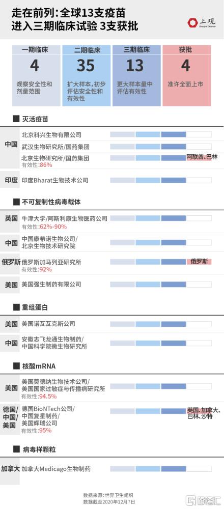 世界卫生组织的疫苗研发情况报告显示,截至12月7日,全球共有214支疫苗正在研发。但其实真正需要关注的,是已经进入临床实验阶段的52支疫苗。目标再缩小一点,是处在上市前临门一脚——三期临床阶段的13支疫苗。
