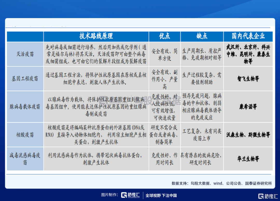 2020年2月21日,国务院应对新冠疫情发布会,明确了5条技术路线,分别是灭活疫苗、基因工程疫苗、腺病毒载体疫苗、核酸疫苗以及流感病毒载体疫苗。