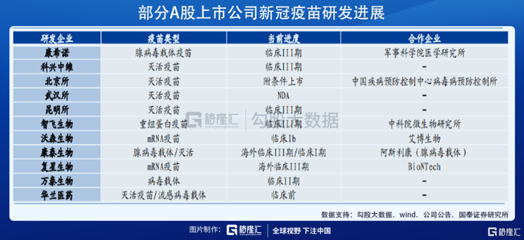 截至2021年1月6日,除国药集团北京所已获批附条件上市外,国药武汉所也提交了上市申请,康希诺、科兴中维、国药集团昆明所、智飞生物、康泰生物(合作)、复星医药(合作)也已开展Ⅲ期临床。
