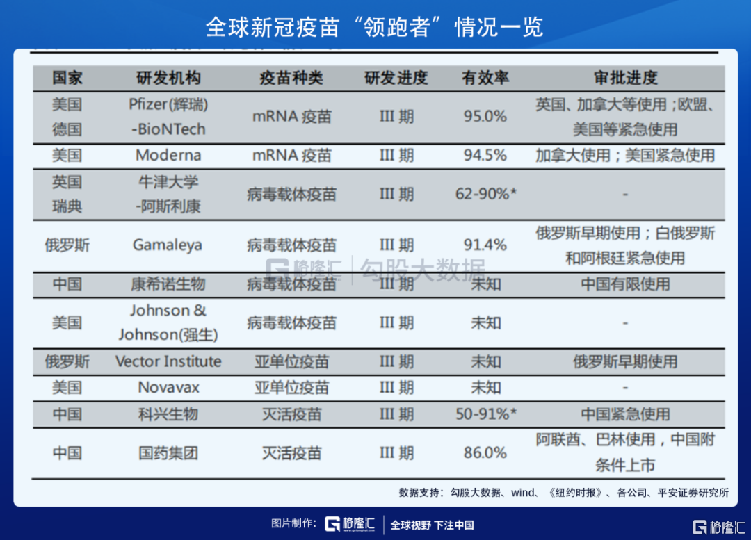 综上,目前有 3款疫苗(辉瑞、Moderna、国药集团)已在部分国家正式获准使用,多款疫苗获准紧急使用。